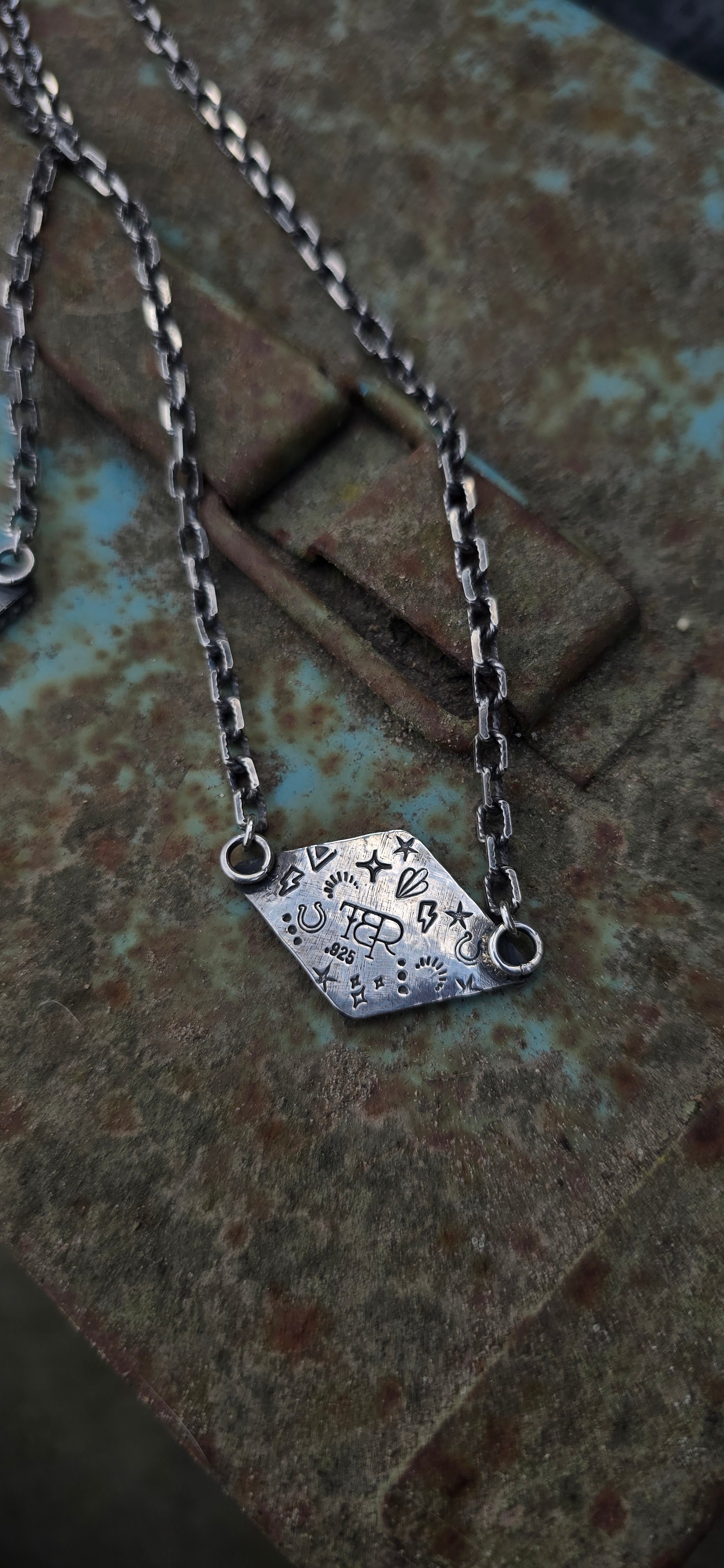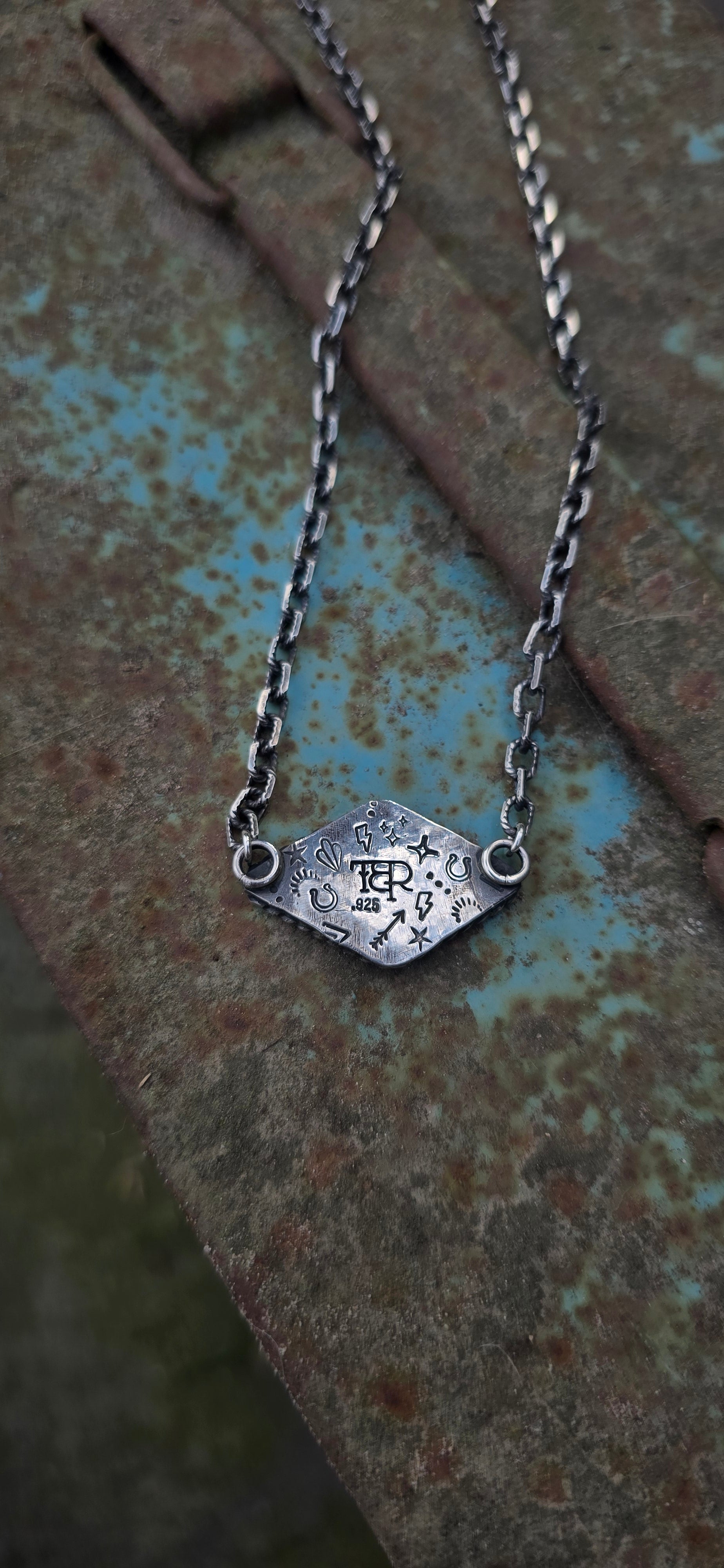 Rock on skelly necklaces, perfect for spooky season... but even more perfect for all the time. These are both on a nice heavier 16" beveled twisted wire chain. Sterling Silver with signature hand stamped backplate.